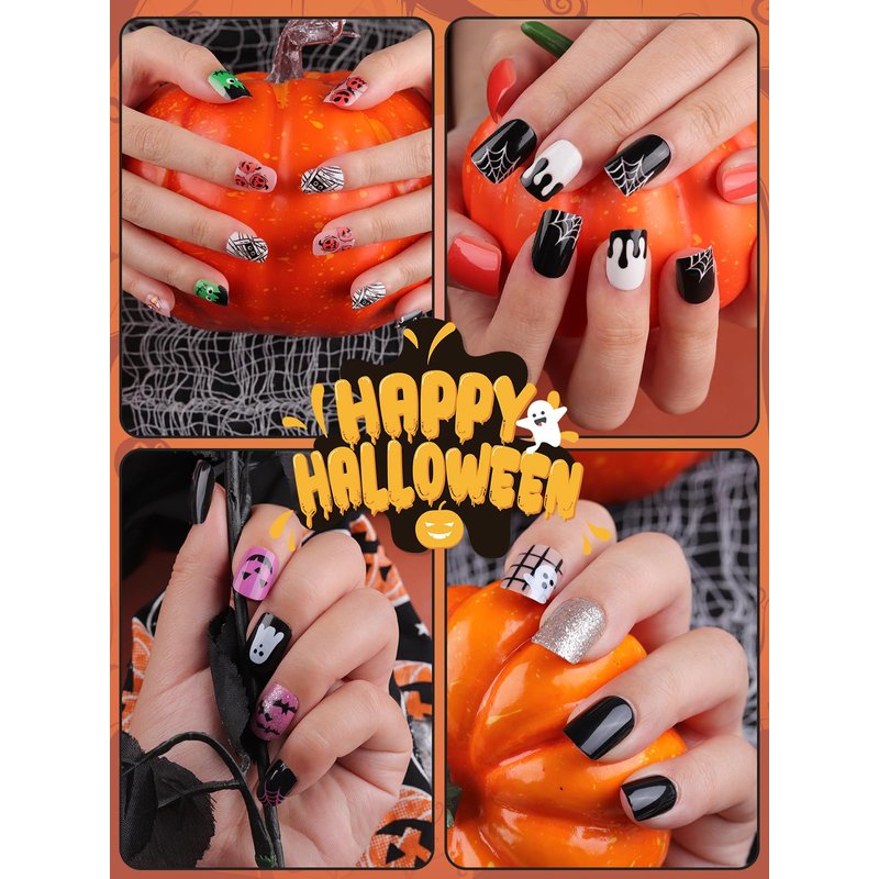 - π· Various Patterns: The acrylic Halloween press on nails have different patterns design related to Halloween, including lots of classic style images: spiders, skeletons, ghosts, cats, pumpkins, skulls, bats and so on., which will help you feel the festive atmosphere more intimately.