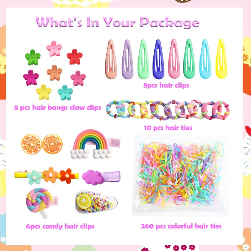 - 292 PCS VALUE PACKGES: Hair clips set includes 260pcs colorful toddler hair ties, 10pcs soft hair ties, 8pcs non-slip snap hair clips, 8pcs mini flower claw clip, 6pcs candy rainbow hair clips. Such a rich 292pcs hair clips set is sure to meet your needs well