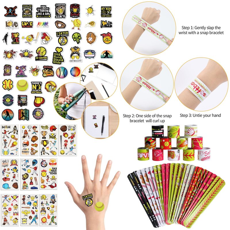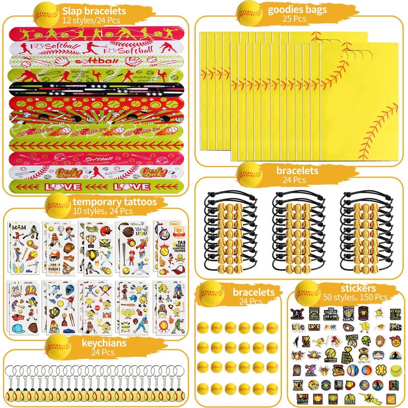 295 Pieces Softball Party Favors Supplies Set Bulk Mini Softball Slap Bracelet Tattoo Sticker Keychain Adjustable Bracelet Goodie Bag Fillers for Sports Softball Party Gifts Bags (Softball)