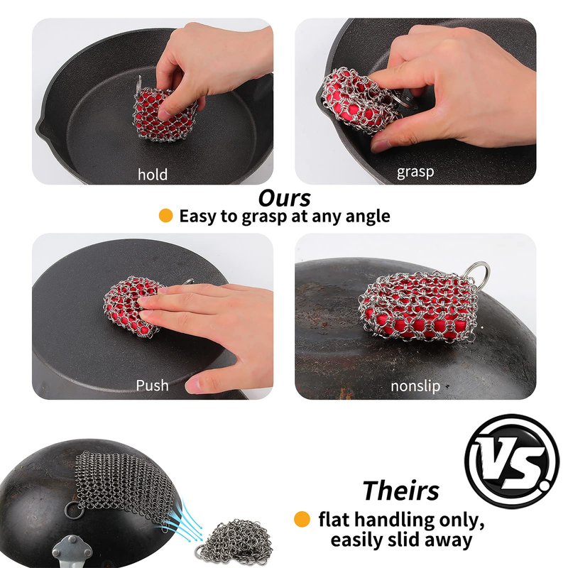 - 【Sold in Pack】 Lower your cost by sold in set of 2, Thanks to the easy to grasp , solid-yet-flexible core, you can grab onto this cast iron cleaning tool instead of flat handing it, it also cleans parts of the skillet that couldn’t be reached well with the flat chain.