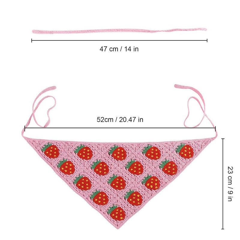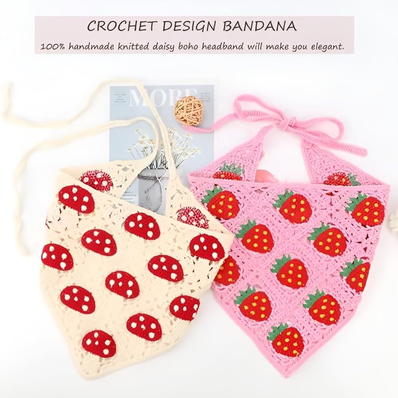 2Pcs Handmade Crochet Bandana Head Kerchief Hair Scarf Knitted Scarves Tie Bcak Floral Head wrap for Women Girls Floral Crochet Hair Bandana Strawberry Mushroom (pink+beige)