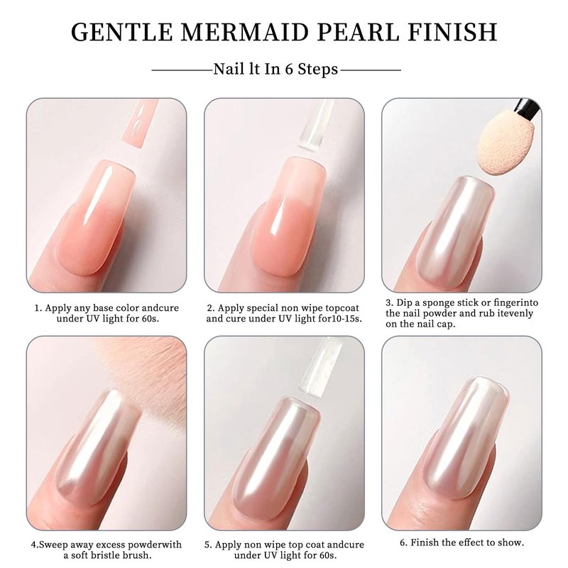 - Easy To Use: Apply the top coat cured 30s (You can use the nail gel polish color you want before this step), use the nail sponge stick to dip the pearl chrome nail powder and then rub the glass pearl effect on the nails, apply the top coat cured 60-90s.