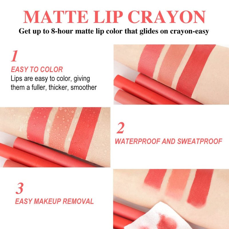 - Matte Lip Liner: Contains 3 stick lipsticks, glides a rich layer of smudge and transfer resistant matte dusty mid-tone color across your lips.Longwearing more than 8 hours.