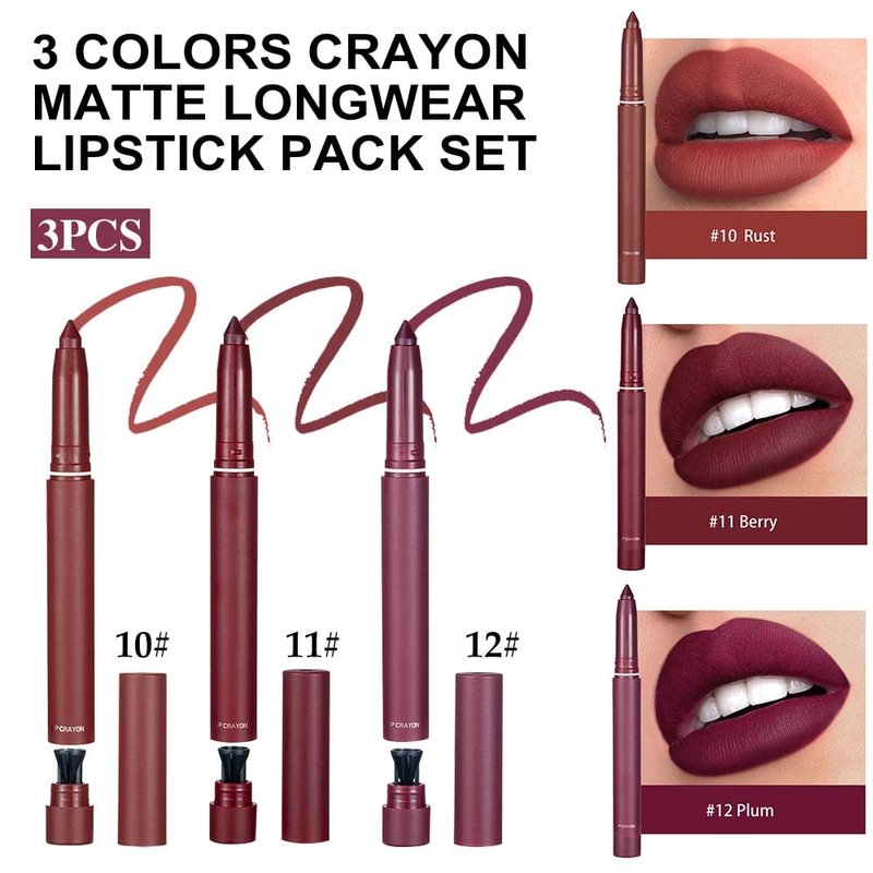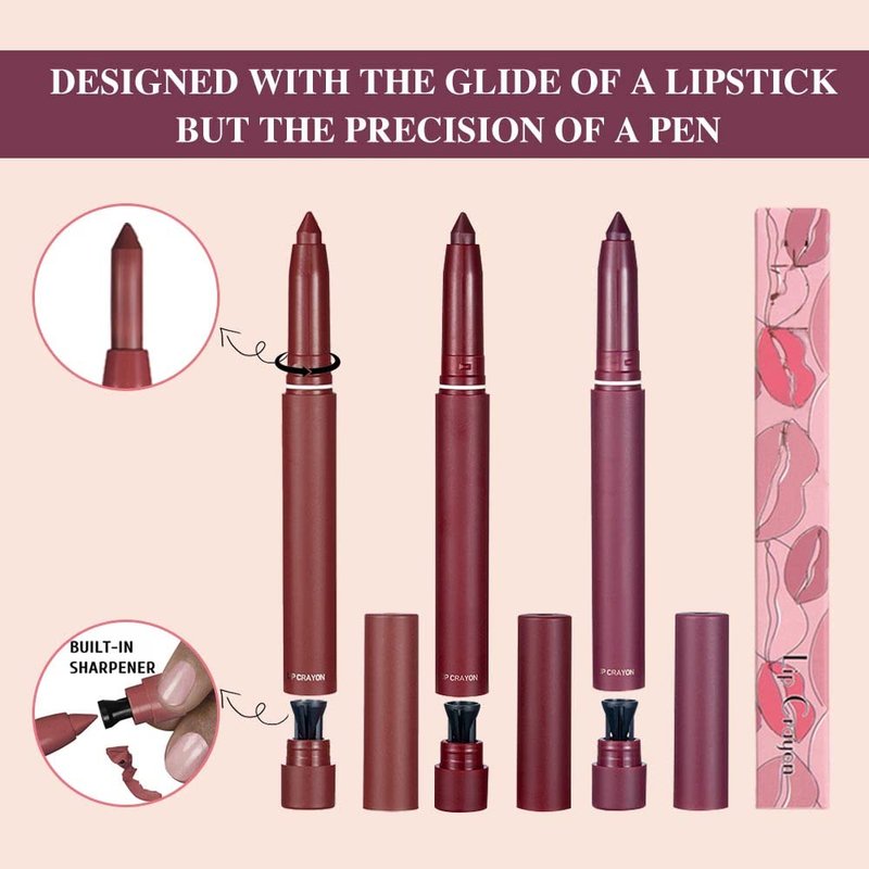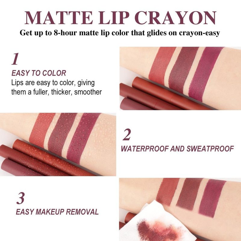 - Matte Lip Liner: Contains 3 stick lipsticks, glides a rich layer of smudge and transfer resistant matte dusty mid-tone color across your lips.Longwearing more than 8 hours.