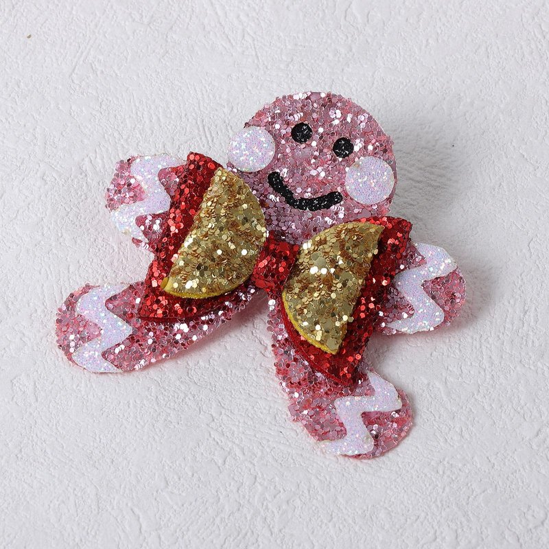 - Festive Gingerbread Man Design- Celebrate the joy of the holiday season with our glitter sparkly Christmas Gingerbread Man bow hair clip. Cute gingerbread house festive hair accessory features charming cute fun gingerbread man shape design,sparkling gold,red,white,pink glitter fabric, bringing a whimsical element to any holiday party outfit,dress or gingerbread man costumes.