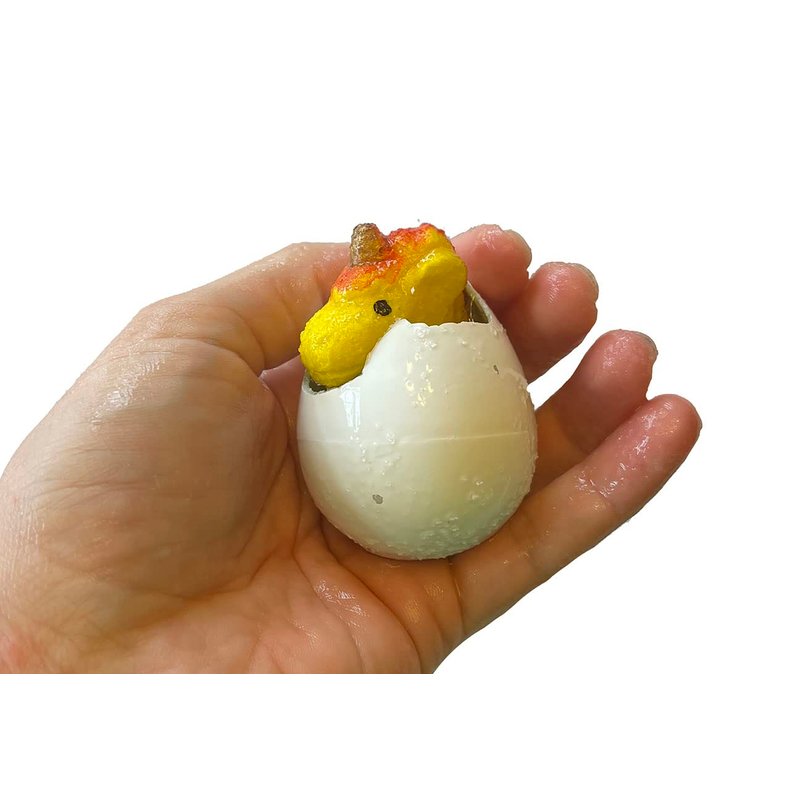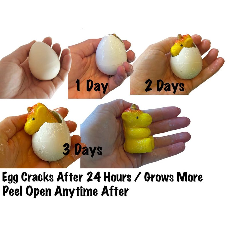 SET OF 3 EGGS - This unicorn is one of those grow pets that slowly expand and grow after being submerged with water. Place the 2.25" x 1.75" egg in water and the mystical creature will slowly grow up larger and hatch out of the egg into a unicorn. Full grown unicorn measures about 2.5" x 1.75" x 1.75". Dry out and use it again. It shrinks with salty water though most shrink simply from air after being removed from water. This is a fun bath or pool toy! Ages 8+. RANDOM COLOR. Please note that these eggs take at least 24 hours of being soaked in water for the egg to start to crack. Animal gets full size at about 48 hours. Expandable water toys or grow-in-water toys are made from a superabsorbent polymer. Superabsorbent polymers are long chains of molecules that soak up tremendous amounts of water because the water is drawn into and held by the molecules of the polymer. These polymers can absorb as much as 500 times their weight in plain water. They are toys that expand after putting them into water for several days.