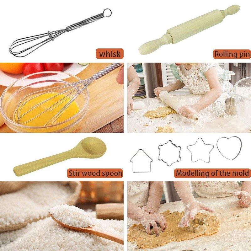 - Kids Cooking and Baking Set - set with apron, chef hat, oven gloves, egg beater, wooden spoon, rolling pin, 4 cookie molds, fully equipped