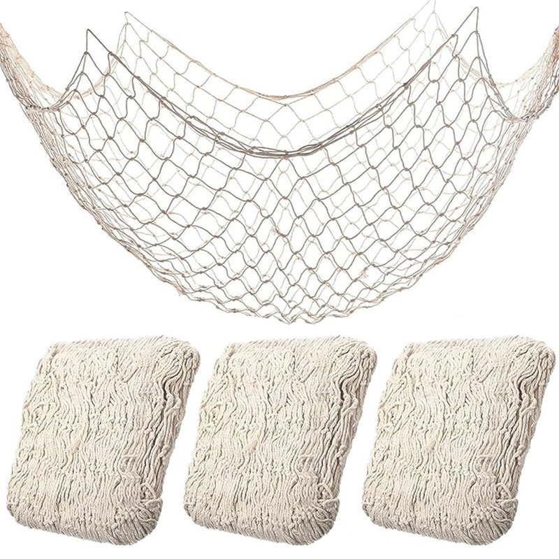 3 Pack Fish Net Decorations for Party,Natural Cotton Hawaiian Party Fishing Net Decorative, Nautical Themed Cotton Fishnet Pirate Party Decor
