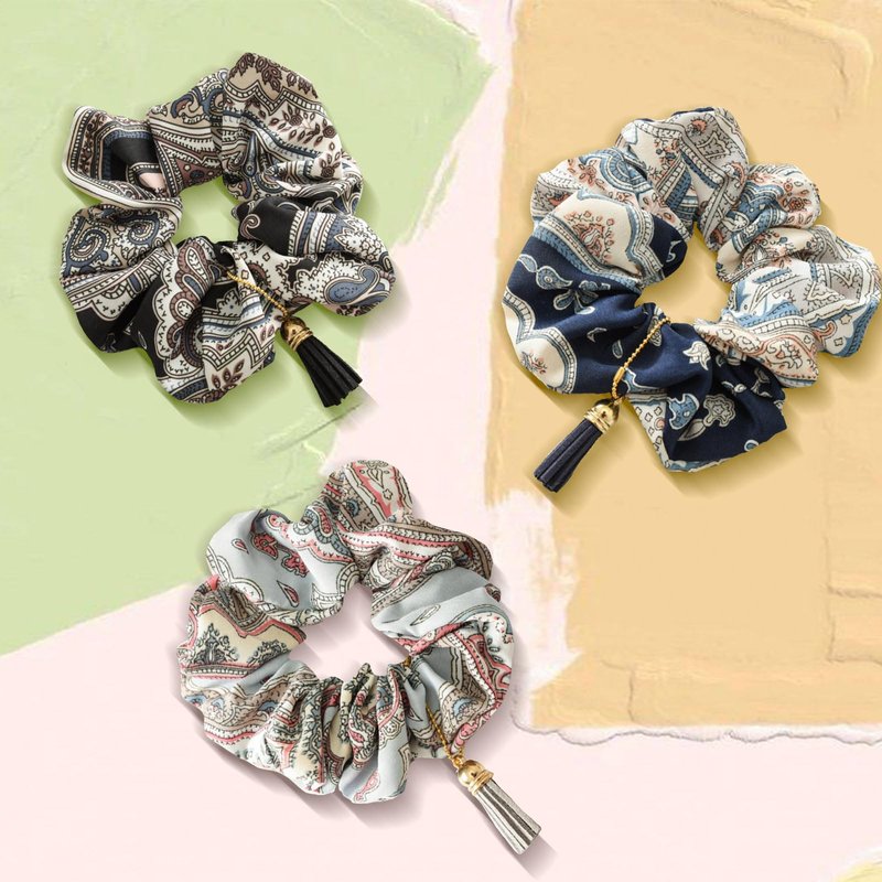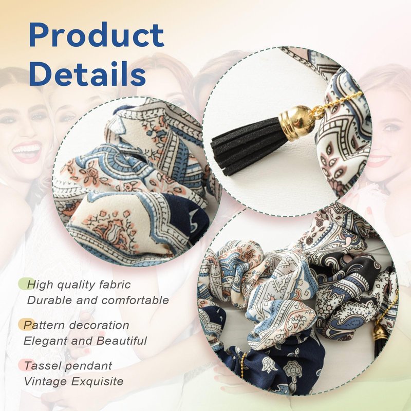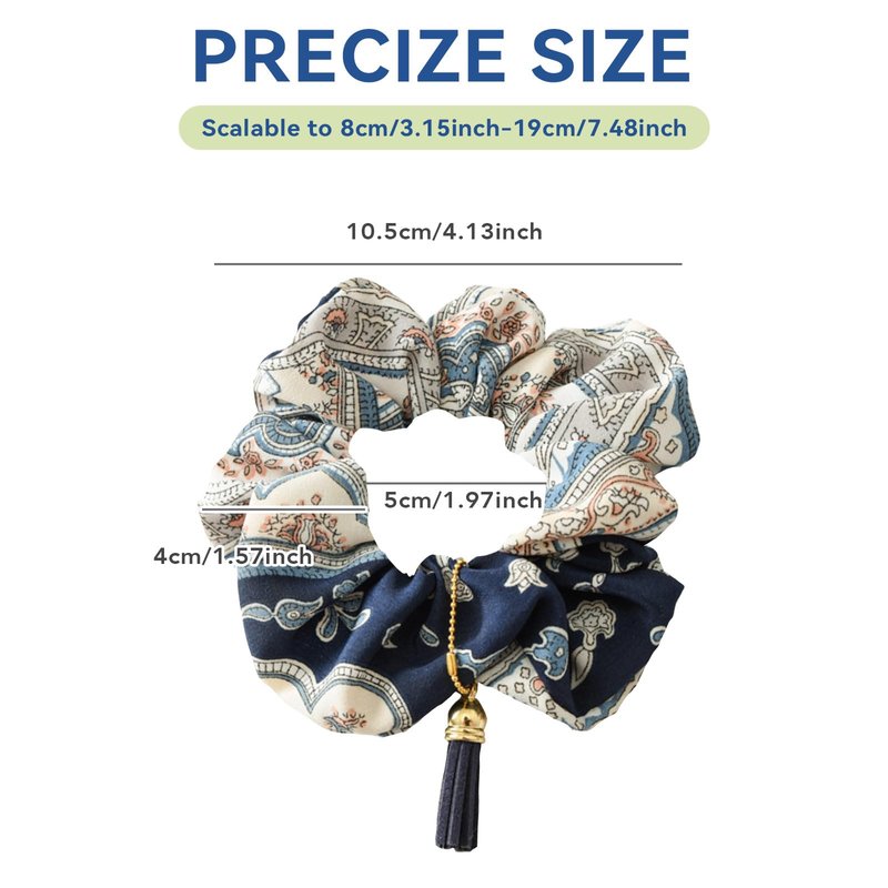 3 Pack Tassel Scrunchies for Thick Hair, Flower Hair Scrunchies for Women Printed Multi Colors, No Crease Hair Accessories Soft Ropes Ponytail Holder, Retro Fabric Hair Bands(C#)