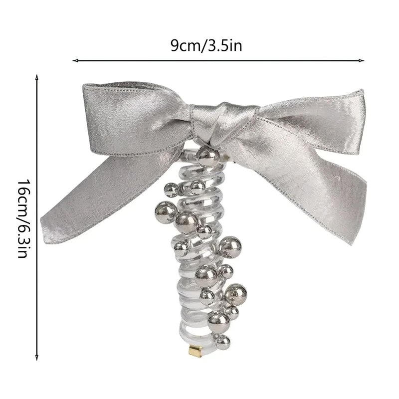 3 PCS Bowknot Braided Telephone Wire No Damage Black White Silver Pearl Ribbon Hair Bands Elastic Spiral Coil Hair Ties Phone Cord for Women Elegant Ponytail Holder Accessories