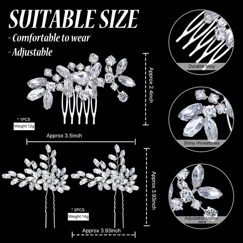 - Measurement: the bride hair comb measures approx. 3.5 x 2.4 inches, it is convenient to comb most hair thicknesses; The hair pin is about 3.93 x 3.93 inches, the proper size is suitable for you to create various hairstyles; They are texture yet lightweight, can meet your multiple occasions needs