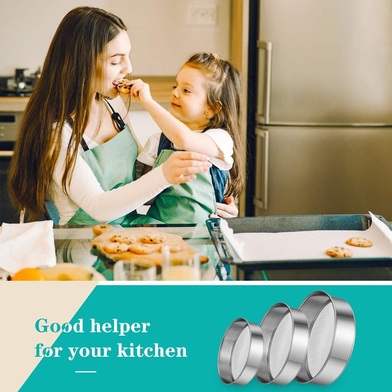 - You will get :3 pieces stainless steel round sifter include 60 mesh (6-inch and 8-inch) 40 mesh (7-inch) sieve fine mesh for bake decorate cakes, pies, pastries, cupcakes