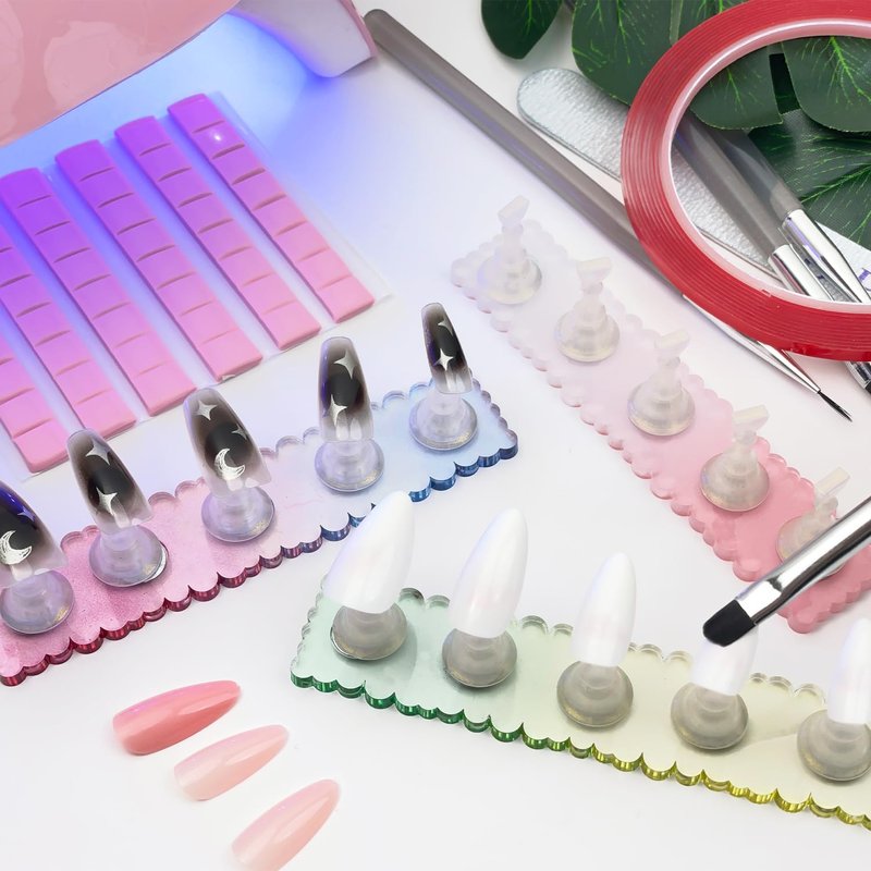 - Must Have for Doing Your Own Nails:Our product include all items you need for nail art design.You will receive 3 pcs acrylic nail stand,1 crystal nail base,16 pcs nail tip holder,48 pcs reusable adhesive putty and 1 pcs 9.8Ft Double-sided Tape.Generous combination of nail stand set can meet all you daily nail art design demands.