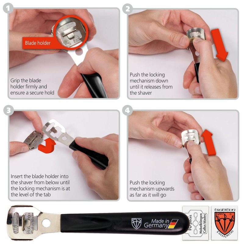 - Removing calluses is easier if the excess skin has been soaked in a foot bath beforehand. Application of a foot peel or scrub before using the shaver can also be useful for removing dead skin cells before the treatment begins. To avoid injuries, it is important to always place the blade as flat as possible and remove the callus in individual layers, without exerting much pressure.to use high quality 3 Swords replacement blades only. Made in Solingen Germany by 3 Swords Germany since 1927.