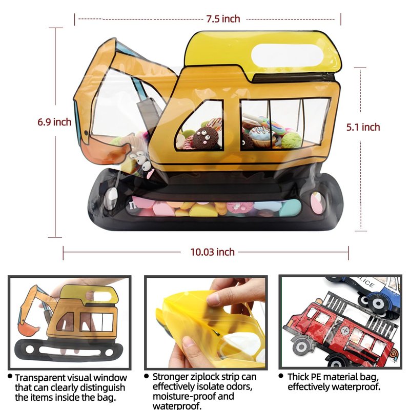 - 【PRODUCT SIZE】Cartoon Police Car goodie bags size:11.02X7.67inch.Cartoon Excavator candy treat bags size:10.23X6.88inch.Cartoon Fire Engine Smell Proof Ziplock Bags size:11.02X7.08inch. Cartoon Bus goodie bags size:11.41x7.28inch.Cartoon Tipper truck goodie bags size:11.22x7.08inch.We have Multi styles candy bags which you can choose.