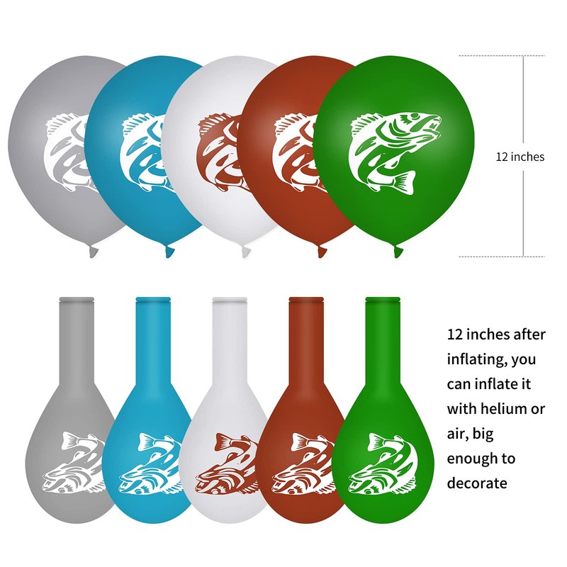 - Distinctive bass design: these balloons come in 5 colors (green, blue, brown, white and gray) and well printed with vivid bass pattern that full of gone fishing elements, bring a pleasant and enjoyable atmosphere to you and your friends