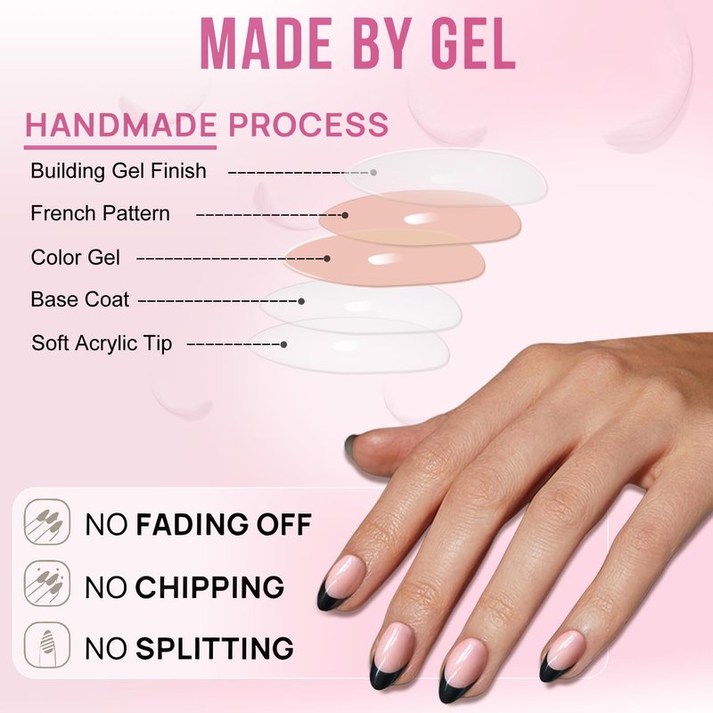 - đăPremium Gel NailsăAcrylic press on nails medium almond nails are made of high quality acrylic material,the nail tips are elastic and not easy to break.The surfaces of the short false nails french nails all have a high-gloss protective gel finish,with repeated use,the gels and patterns on the surface of nail art are also not easily worn.medium almond shaped press on nails are designed to match the curvature and thickness of women's nails,ensuring a seamless and comfortable application.