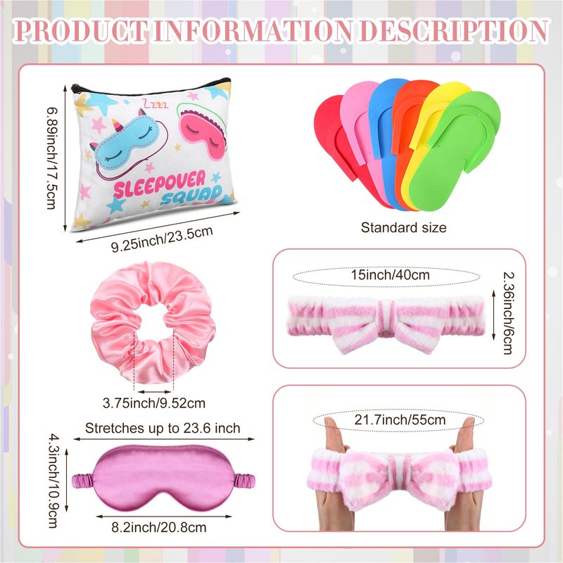 - Abundance in supplies: the girls spa set includes an ample quantity of 6 pcs satin eye masks, 6 pcs satin hair scrunchies, 6 pair of slippers, 6 pcs headbands, and 6 pcs makeup bags with adorable prints to cater to your party needs; This affirms an unforgettable, well attended sleepover party without compromising on individual supplies. They are ideal spa party supplies, party rewards, sleepover party supplies for girls, slumber party supplies for girls