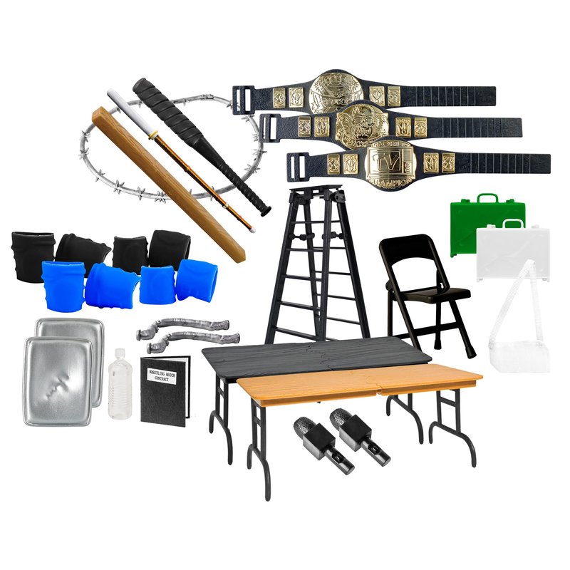 - This comprehensive set includes 2 breakable tables, 2 pipes, 2 trays, 3 championship belts, 2 briefcases, kendo stick, ladder, folding chair and a wrestling match contract for creating intense match scenarios.