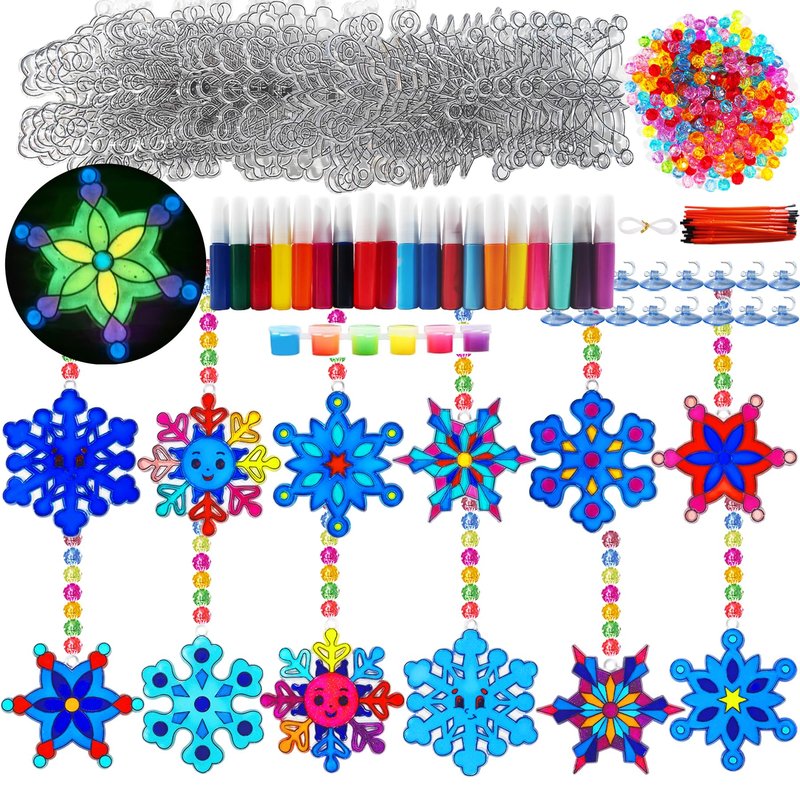 - Snowflake Suncatchers Craft Kits Bulk: DIY window suncatchers crafts kit include 30 pcs fthanksgiving suncatcher kits in 6 assorted styles(each design has 5 pcs), 19 bottles of paints in 10colors(9 suncatcher paint,10 glitter paint) ,1 strips of 6 color glow-in-the-dark paints,30 paintbrushes, 300 pcs acrylic beads,1 roll of 393" fishing thread, 30 pcs suction hooks,complete accessories for easy suncatcher DIY painting.