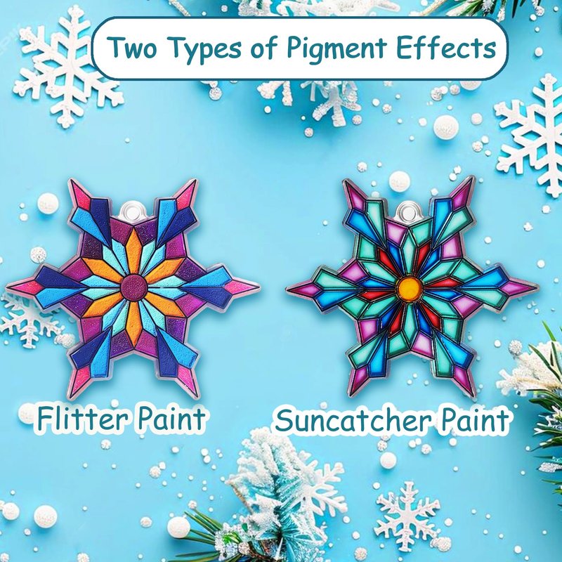 - Material:Winter christmas craft kits are made of transparent plastic that will be sun-through after being painted, The acrylic beads are plastic,9 colorful Suncatcher paints are transparent and 10 colorful solid color paints(glitter paints), Perfect for christmas party,winter party,frozen party,school or homeschooling arts and crafts lessons.