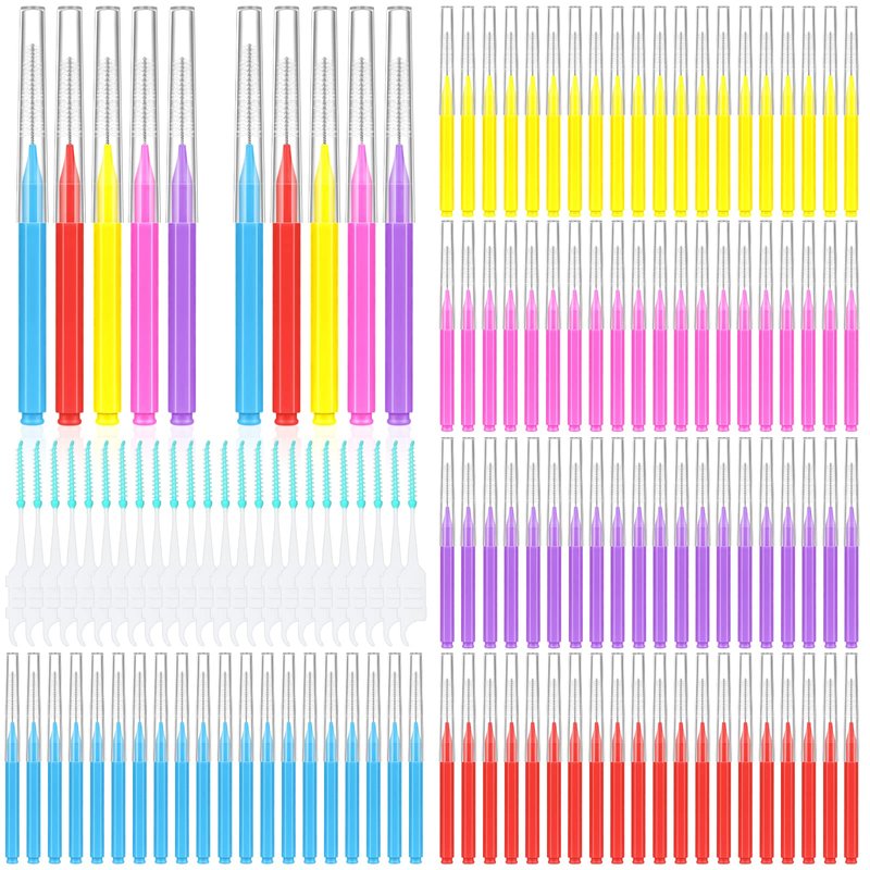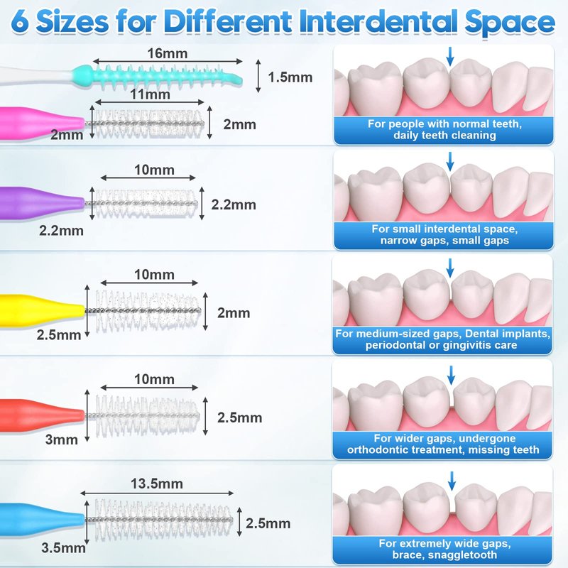 - 𝟯𝟬𝟬 𝗣𝗰𝘀, 𝟲 𝗦𝗶𝘇𝗲 𝗶𝗻𝘁𝗲𝗿𝗱𝗲𝗻𝘁𝗮𝗹 𝗯𝗿𝘂𝘀𝗵𝗲𝘀: You will get 100 pieces interdental brushes in 5 colors(each color represents one size) and 200 pieces of interdental toothpicks. The brushes heads of 6 sizes are suitable for different gaps between teeth. Whether you have narrow or wide gaps between your teeth, uneven teeth, or crowded teeth, you can find the right size interdental brushes. There are sufficient numbers to meet your long-term daily use needs