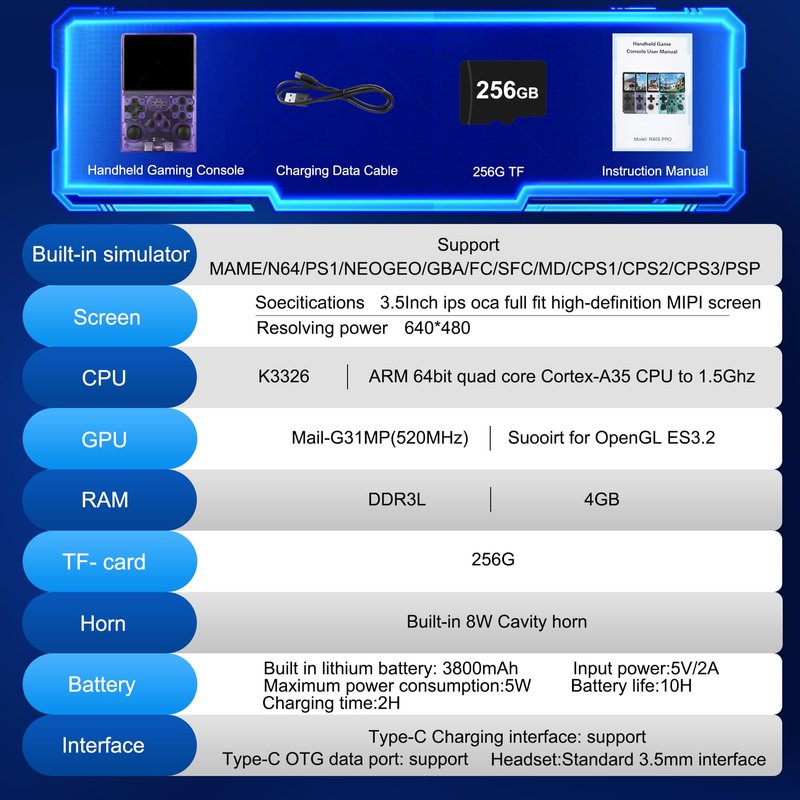 - 【Powerful Performance】 1.5GHz 64-bit RK3326 processor, Mali-G31MP dual-core GPU, and 8GB RAM; the new operating system offers a smoother and more responsive experience. Pre-installed with over 15,000 games, it supports more than 12 mainstream emulators, and the 256GB expandable memory allows for adding even more games.