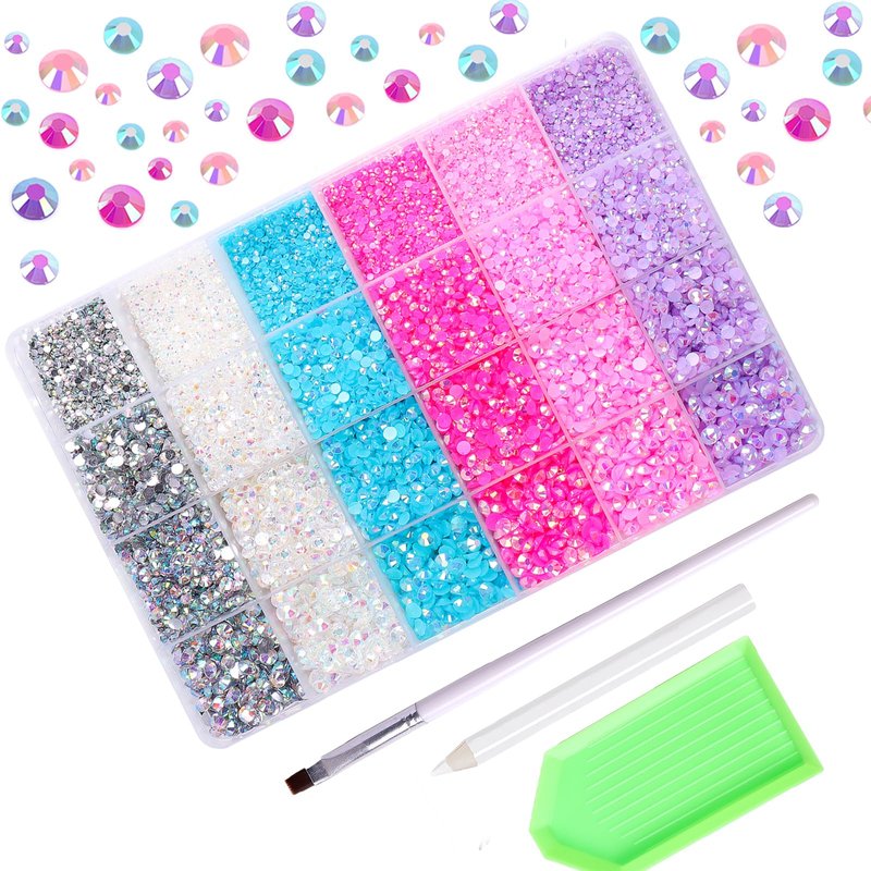 - Flatback rhinestones for crafts:Include 6 colors of AB Crystal Rhinestones. Each color has 4 sizes: 2mm 12000/ 3mm 9600pcs/ 4mm 5400pcs/ 5mm 3000pcs totally 30000pcs round shape rhinestones for craft. 1 wax pen, 1 Tweezer 1 crystal tray and 1 glue brush (Nail glue is not include). Sufficient quantity and rich colors allow you to decorate what you want to decorate as you like.