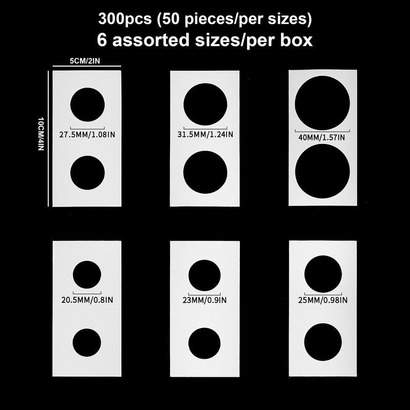 - 300PCS COIN HOLDERS - 2x2 inches coin flips with 6 assorted sizes: 20.5, 23, 25, 27.5, 31.5, 40mm, each size has 50pcs, total 300pcs which is sufficient for daily use