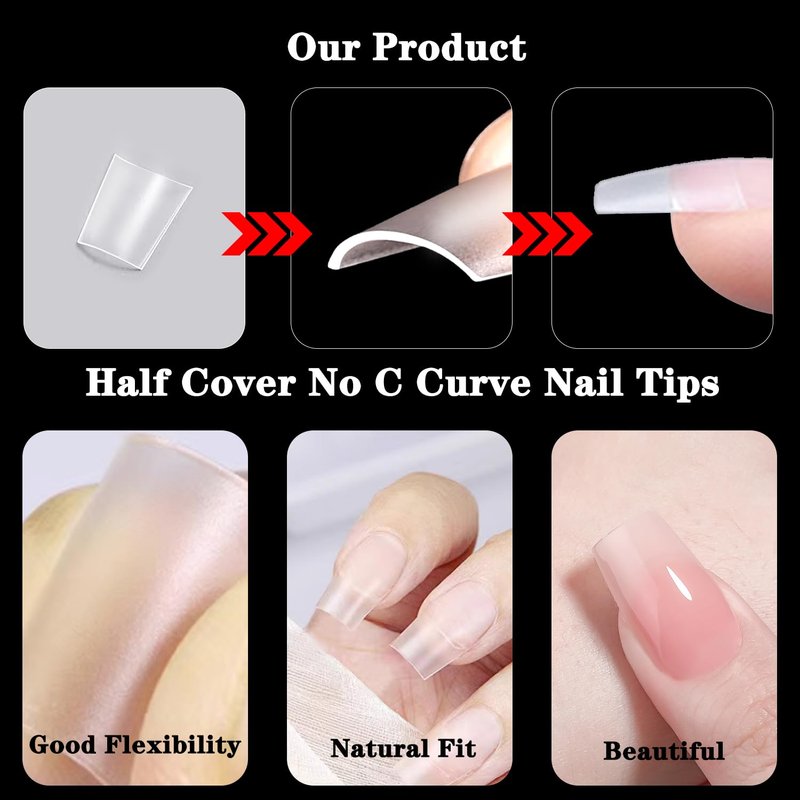 - 💅Upgrade Coffin Nail Tips No C Curve: Our Short no c curve nail tips coffin feature “ Thin back edge, thick front edge”, slightest curvature nail tips that is not deep C can make the half cover nail tips fit your nails better. Half cover no c curve nail tips come with perfect short size , which can help you stick nail easily, won't pop up, providing you with a comfortable and natural look nail experience.