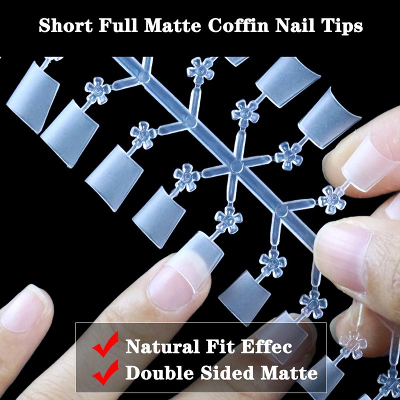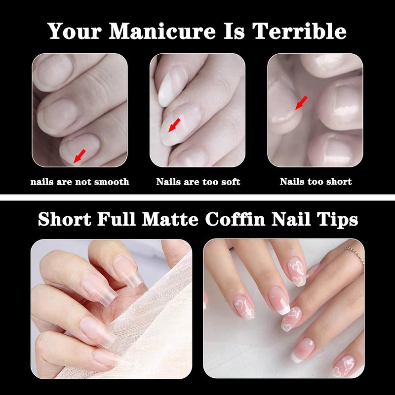 - 💅Full Matte No File Short Nail Tips: The short coffin acrylic nail tips is a double-sided matte nail tip, making an perfect combination with gel and achieve the effect of integration with real nails. Pre-shaped nail tips design is no need to extensive file, saving time and money. Short coffin nail tips adopts a half cover design, which is strongly helpful for people with short nails and fragile nails.