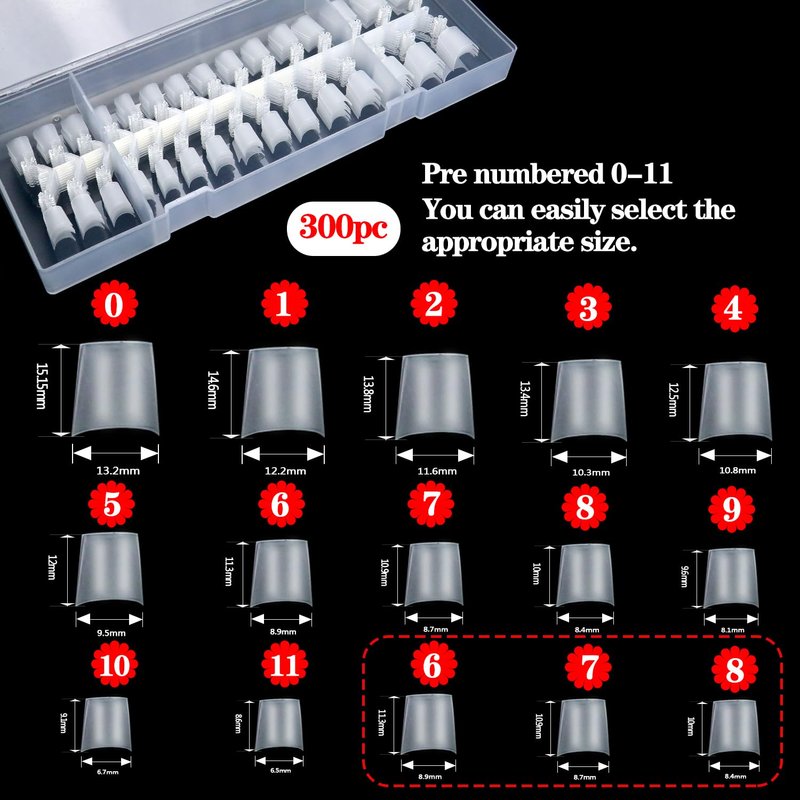 - 💅12 Sizes 300PCS Tips, Add 3 commonly Sizes: Namgznso 300pcs of matte half cover short coffin nail tips are available in 12 different sizes to fit most people's fingers. In addition, we have increased the number of common used sizes #6 #7 #8 in the original sizes to prevent loss or damage. The nail tips are marked with a clear size number at flower shape handle top to quickly find right size. Enough quantity can satisfy your home DIY or nail salon needs.