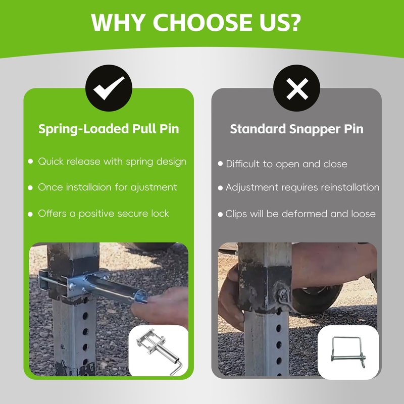 - 【Upgrade Spring-Loaded Design】 The heavy-duty spring loaded landing gear pull pin allows for quick height adjustment and secure hook-ups on your fifth wheel trailer jacks. This fifth wheel gear pull pin will remain attached to your jack so that when you need to raise or lower your jack, you can simply pull on the pin there to adjust the landing gear/front jacks to the desired height.