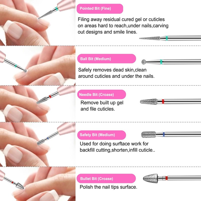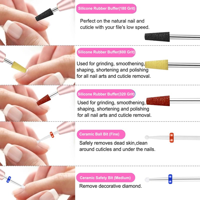 4. Comes with diamond carbide nail bits, ceramic nail drill bits, tungsten carbide nail bits, rubber polishing nail bit and cleaning brush.