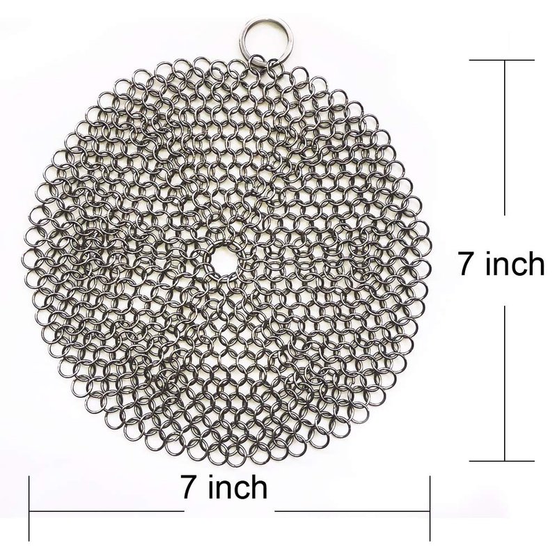 Cast Iron Cleaner 7 Inch Diameter Round Stainless Steel 316 Chainmail Scrubber for Cast Iron Cookware. WORKS LIKE A CHARM ON STAINLESS STEEL COOKWARE ENAMELED CAST IRON, AND MORE..The diameter 7 inch Chainmail Scrubber makes fast work of tough cleanup jobs on just about all the pots and pans in the kitchen, including stainless steel, enameled cast iron, hard anodized, copper and glass.SAVE YOUR HARD EARNED CAST IRON PAN SEASONING You work hard to get your cast iron pans perfectly seasoned. Don't risk losing your pan seasoning with detergents or scraping your pans with metal utensils. FAST Just run your pan under warm water and scrub. Cooked on residue will release quickly and easily. The best time to clean cast iron pans is shortly after cooking when they are just warm to the touch. CLEAN Cleans up fast with a little soapy water or just toss it in the dishwasher. EASY The toughest mess will clean up easy - even after cooking pork chops and leaving the pan overnight. we know, it happens at our house all the time! Customers love the big corner ring. It helps the hold while your cleaning and then just hang the scrubber to air dry.