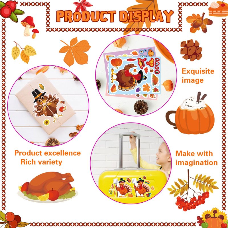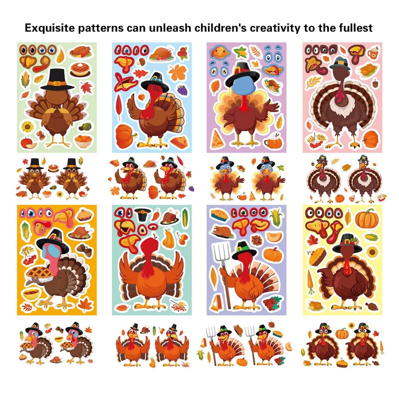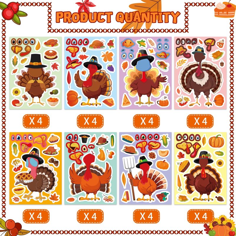 - 🦃🍁【Make Your Own Turkey Stickers for Thanksgiving】Get ready for a festive Thanksgiving with 32 adorable stickers (size: 8.26 x 5.9 inches) featuring 8 charming Turkey designs! Bursting with Thanksgiving-themed elements like turkeys, pumpkins, autumn leaves, cornucopias, and harvest fruits!