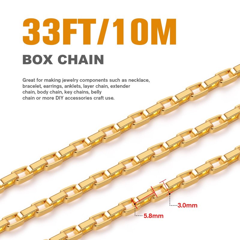 33 Feet 18K Gold PVD Plated Stainless Steel Box Chains Bulk, 3mm 304 Stainless Steel Chain Spool Square Link Box Chain Roll Bulk for Jewelry Making