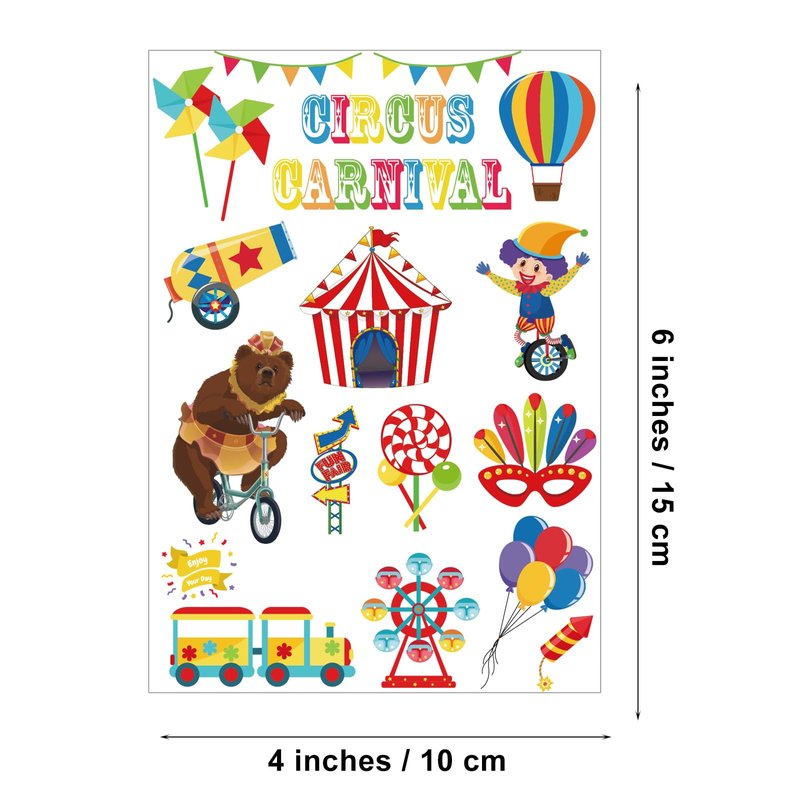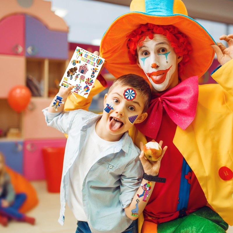 - More Quantity and Style: You will get 24 sheets circus theme waterproof temporary tattoos(8 diffrent patterns sheets 3 each), around 336 pieces in total(112 styles), this means that each child at the party can affix their favorite fake tattoo. Designed for children, our carnival tattoo stickers come in a variety of shapes and styles for boys and girls, adding to the fun of applying, sharing and swapping.
