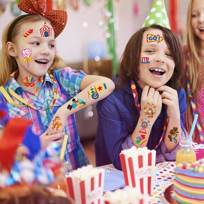 - The Perfect Party Accessory: 24 sheets of temporary tattoos are enough for kids to decorate themselves or used as circus decor, carnival game accessory, gift bag fillers, party favors for kids, party bags and seasonal events like halloween party gift fillers, christmas gifts, summer party kids body decoration, beach pool party, school class sarnival Prizes tattoo, circus pinata Popular hit with the Kids of all ages.