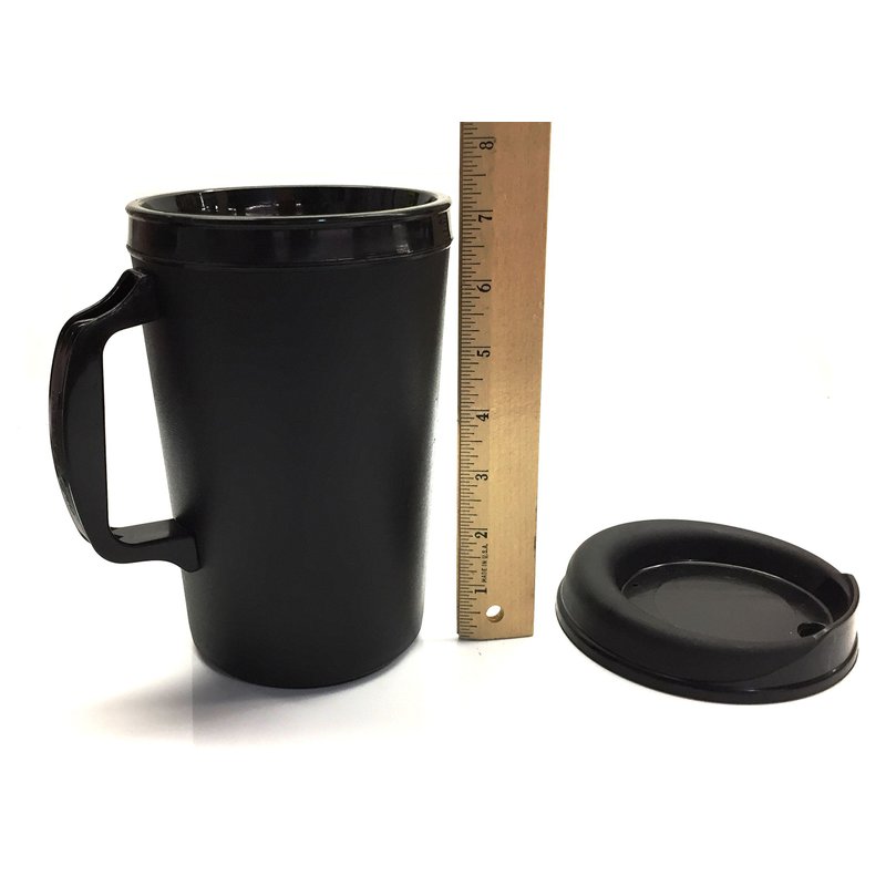 A good coffee mug is like a comfortable pair of Jeans or your favorite boots - it just feels right. The 34oz mug was the large size that was available at most Gas Stations and Convenience Stores. A few years ago they suddenly disappeared from the market and haven't been seen since. Well, we found the mold and arranged for a special production run of mugs. These mugs are produced under the patent #3684123. They are double wall insulated and unlike other mugs on the market, they are foam filled so they are far superior at keeping drinks hot or cold. These rugged mugs are both dishwasher and microwave safe. The lid snaps on tight and doesn't leak out the sides like most of the Chinese imports! This listing is for one Black mug with a black top. There is no printing or graphics on this mug.