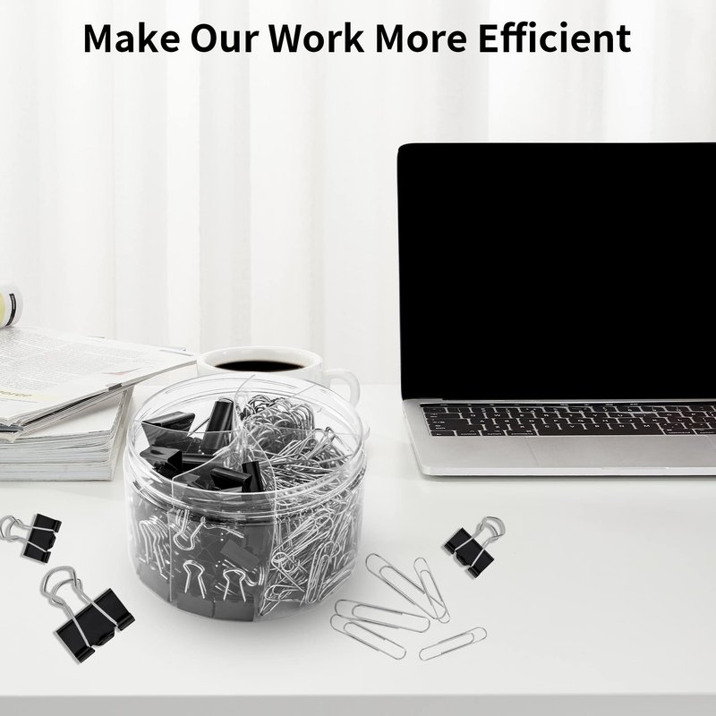 - 【Easy storage】 Large paper clips, medium paper clips, small paper clips, medium binder clips, small binder clips and mini binder clips lie in a plastic container with 6 separated compartments for each size. Easy access and keep your desk and drawer neat