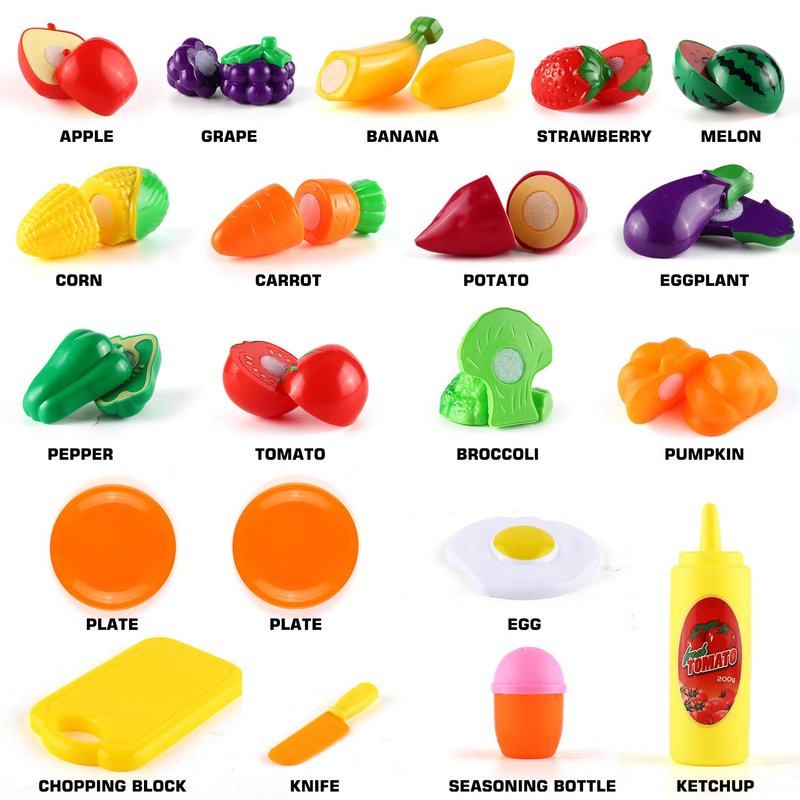 - A CREATIVE PRETEND FOOD CUTTING FOOD PARTY! The Play Kitchen Accessories Set inspires kid to take on the role of a chef, teach them some simple culinary skills. Variety of unique and vibrant colors to create a realistic feel for kids while playing.