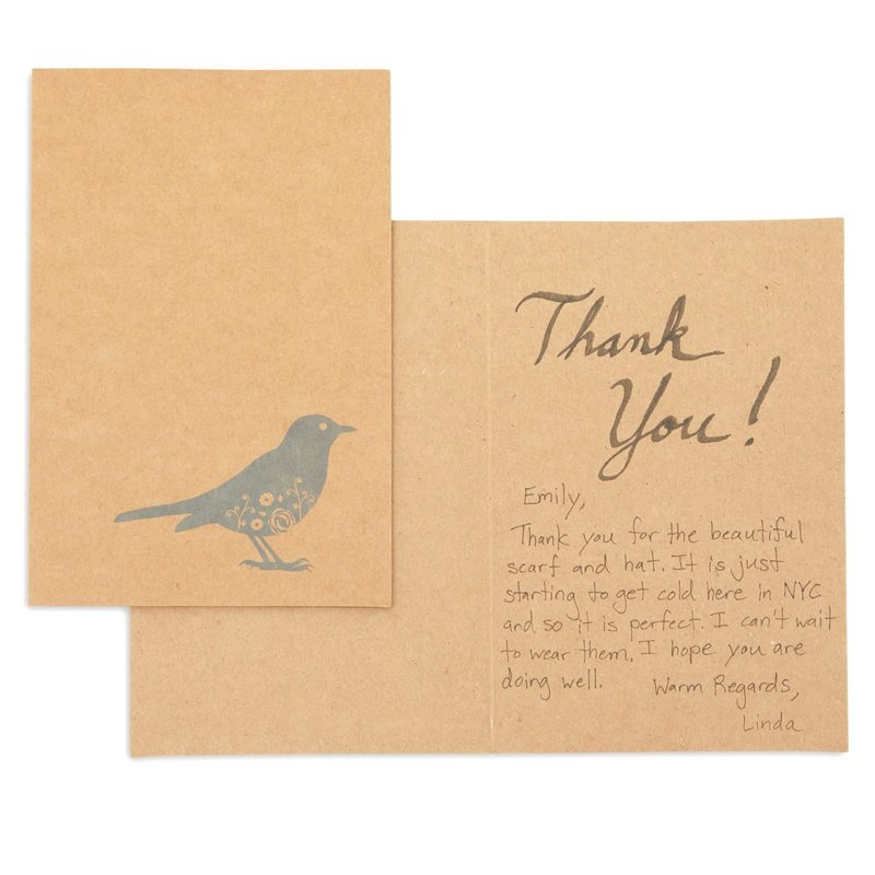 - Notecards and Envelopes Set: This boxed set of bird thank you cards comes with 36 blank notecards and 36 corresponding v-flap envelopes in 6 silhouette bird designs