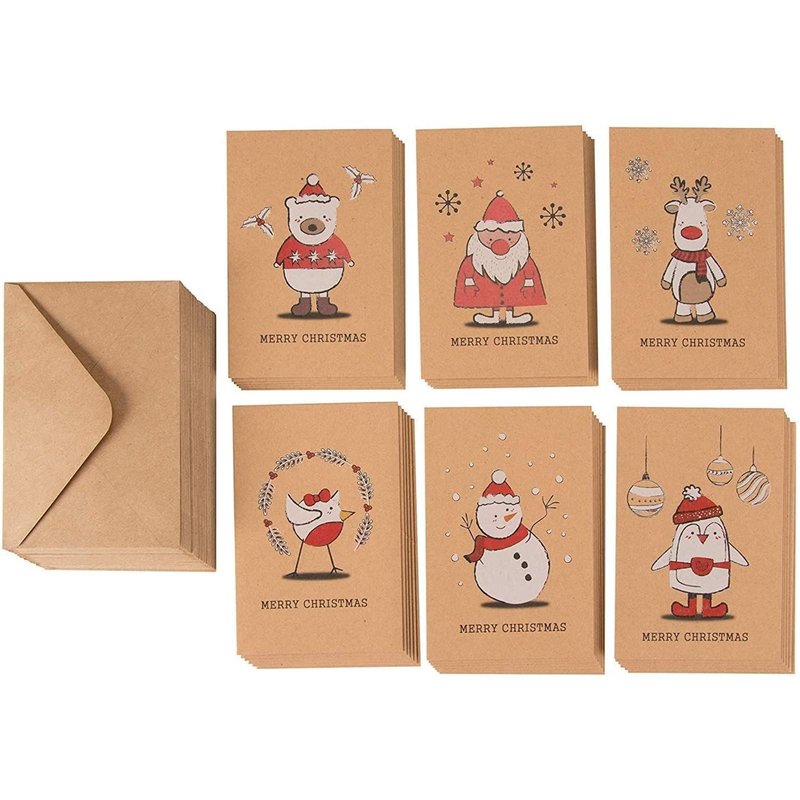 - Bulk Christmas Cards: This box of kraft holiday greeting cards contains 36 festive cards with 36 corresponding brown envelopes to send warm wishes this holiday season