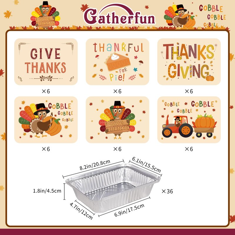 - This package comes with 36 pieces of Thanksgiving leftover containers with lids, sized at 6.1"W x 8.2"L x 1.8"H each. Made from aluminum, every container features a decorative lid which not only preserves food but adds a touch of style as well.