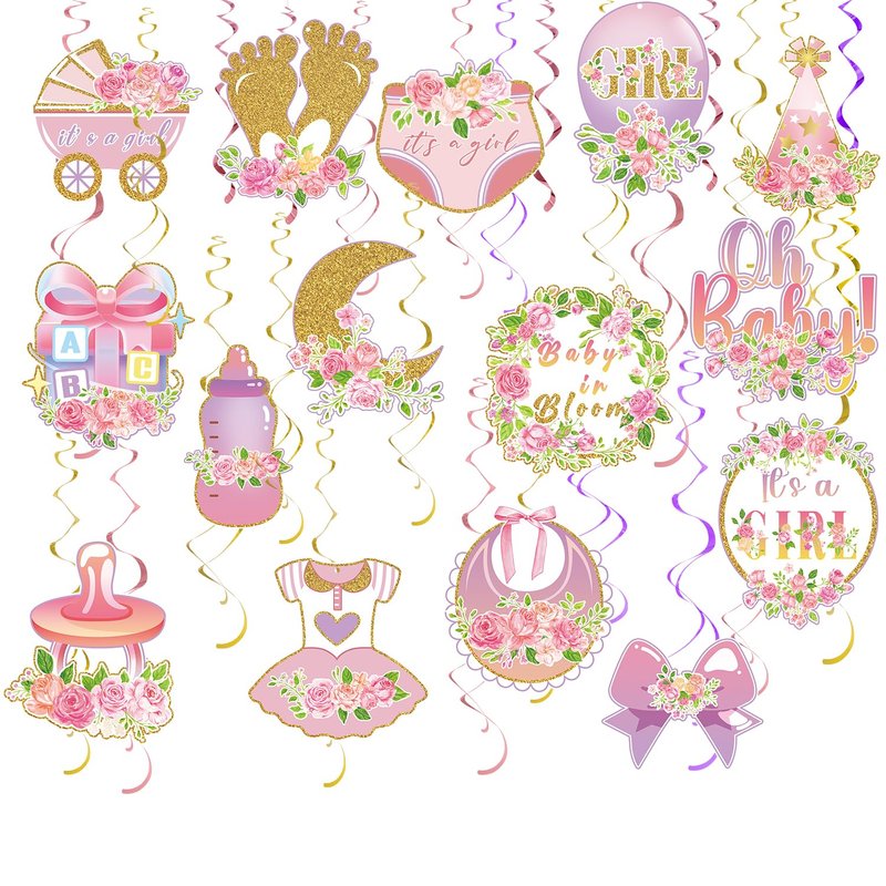 - CUTE GIRLS THEME PARTY DECORATION SWIRLS:These girls ceiling hanging streamers decorations kit composed of moon,bows, balloons, feeding bottles,bibs,dress and so on.15 various patterns of cute girls hanging streamers with different hanging lengths,sizes and shapes,can decorate the baby shower party well and impresses your guests.