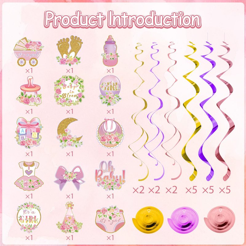 - ALL IN ONE PACKAGE: You will get 36 piece of girls baby shower party hanging swirls decorations,including 15 pieces of various baby shower cards with double sided printing cutouts,15 single spiral and 6 double spiral decorations.cute 3D design and suitable as table decoration for baby shower theme or gender reveal birthday party decor.