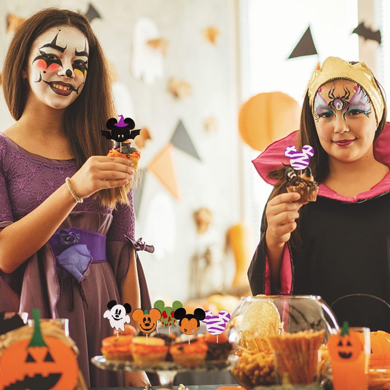 36 PCS Mini Mouse Inspired Halloween Cupcake Toppers Glitter Witch Hat Bat Zombie Mummy Ghost Spooky Cupcake Picks for Halloween Mini Theme Baby Shower Birthday Party Cake Decorations Supplies