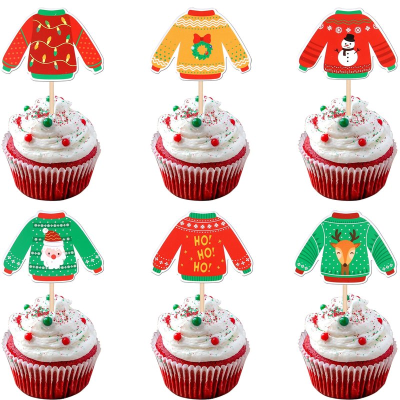 Ugly Sweater Cupcake Toppers for Merry Christmas Theme Xmas New Year Holiday Party Baby Shower Birthday Cake Decorations Supplies