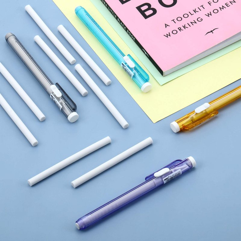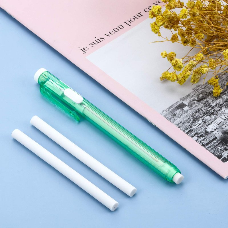 36 Pieces eraser pen, include 6 pieces colorful pen and 30 pieces eraser pen refills, pencil eraser eraser refill retractable pen mechanical eraser art eraser for school office painting writingEnough quantity: Each retractable press eraser with 5 pieces additional refill erasers. 6 Pieces press eraser pen and 30 pieces eraser refills in total, rubber is soft, not easy to break and not waste shell. Features: Made of quality rubber, lightweight and good flexibility, has less rubber clippings, so you can enjoy a cleaner desktop and it is more durable. These eraser sticks are easy to use and wipe, can erase the wrong words or lines easily and cleanly without tearing paper. More other uses: The eraser pencil great for home, school and office. It is a good gift for students to painting, writing or study. Specification: Eraser refills color: whitePen color: royal blue, light yellow, light green, light gray, pink, light blueRefill erasers size: 9.4 cm/ 3.7 inch in length, 0.65 cm/ 0.25 inch in diameterPackage includes: 30 x Refill erasers6 x Eraser penWarm notice: Manual measurement may have small errors. The colors may look different due to different monitor settings, please understand.